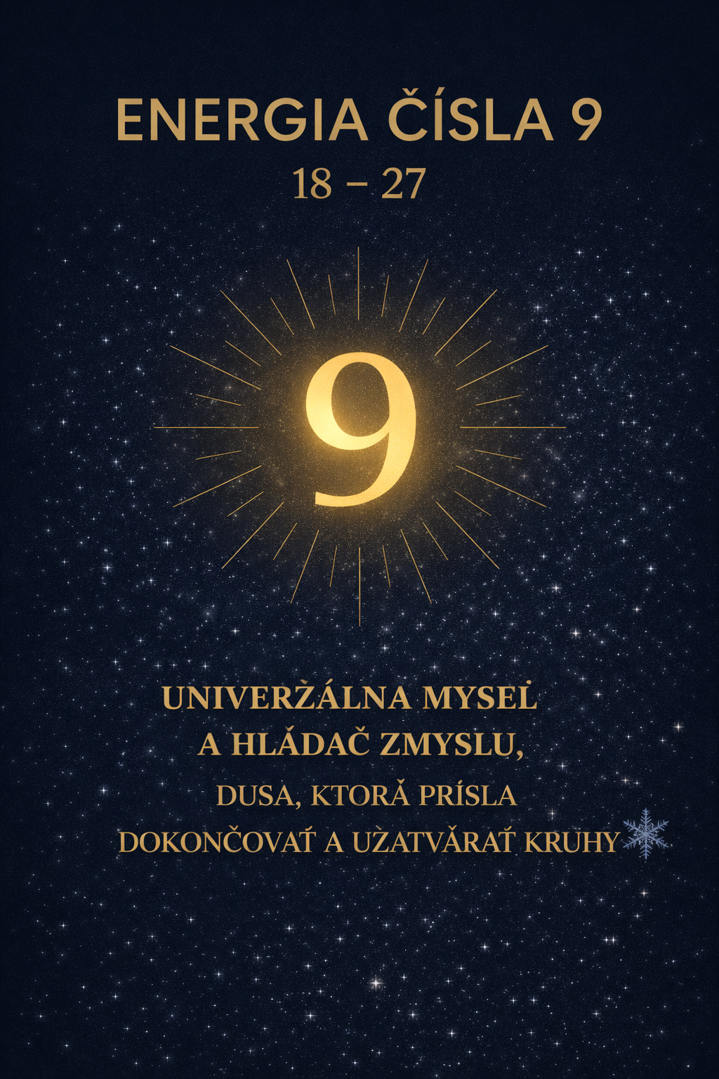Číslo 9 je univerzálne číslo. Nesie v sebe múdrosť, skúsenosti a hlboké pochopenie života. Deviatky majú silnú myseľ, výborný rozum a schopnosť nájsť riešenie takmer na všetko. Často však žijú viac v hlave než v srdci – analyzujú, hodnotia, premýšľajú… a zabúdajú cítiť.
